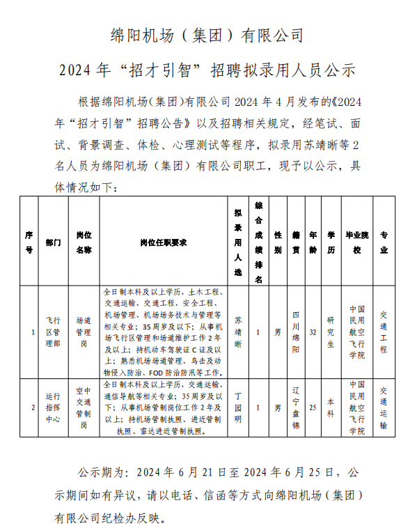 綿陽機(jī)場(集團(tuán))有限公司 2024 年“招才引智”招聘擬錄用人員公示